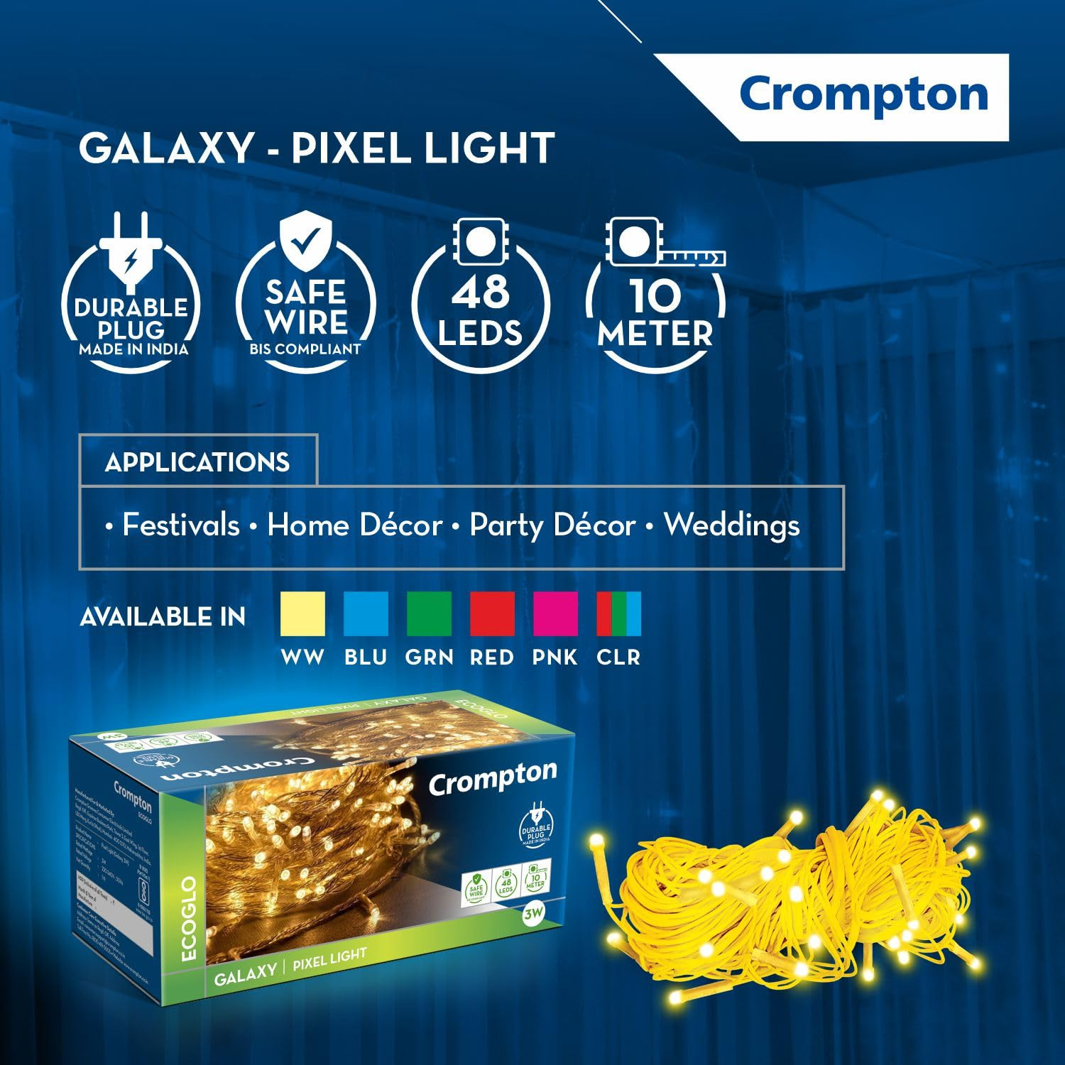 Crompton Galaxy Pixel Light | Festive Ladi Lights | 10 Meter | 48 LEDs | Warm White | Pack of 1 | Direct 2-pin Plug | BIS Safe Wire | for Home Decoration, Diwali, Festival, Birthday, Marriage
