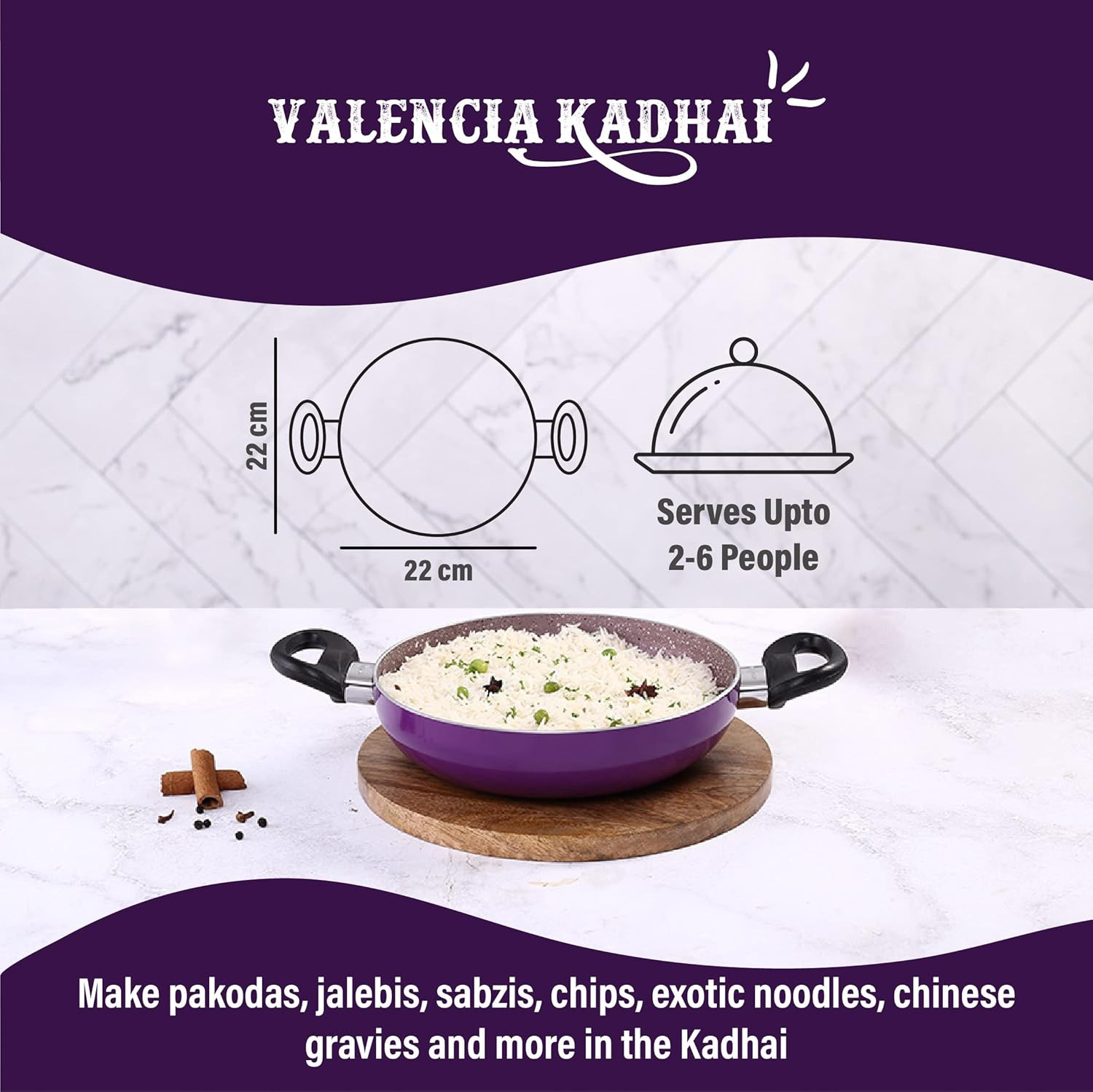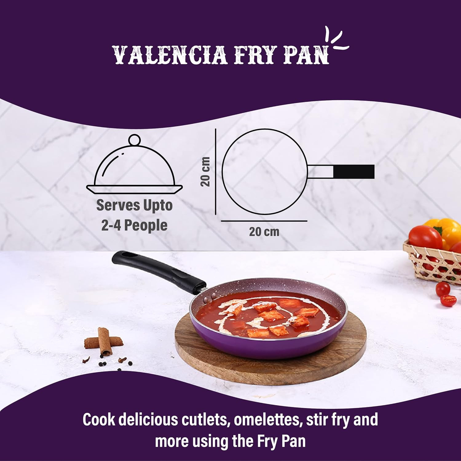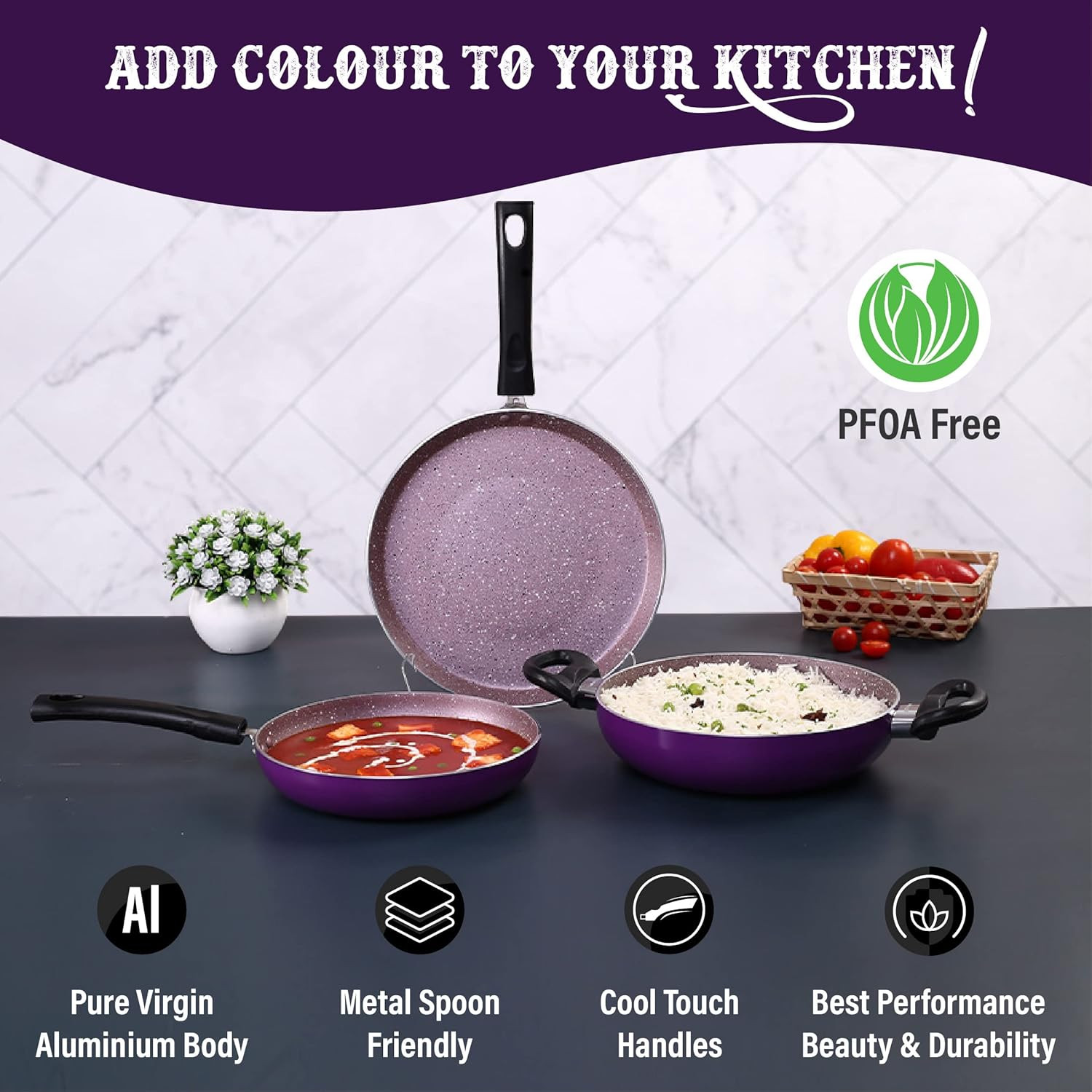 Wonderchef Valencia Non-Stick Cookware 3 Piece Set | Kadhai, Fry Pan, Dosa Tawa | Cool Touch Bakelite Handles | Pure Grade Aluminium| PFOA Free| 2 Years Warranty | Purple